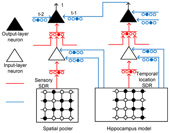 The temporal memory (TM) in Figure 1a puts together the “what” and “when/where” vectors that come from the spatial pooler and hippocampus model, respectively [22,23]. By combining the “what” with “when/where”, the temporal memory can perform both the spatial recognition and the temporal prediction. For the temporal prediction, the representation of temporal succession (“when”) should be segregated from the representation of the content (“what”), as shown in Figure 1a [24,25]. From the experimental observations, the hippocampus has been known to play a central role in encoding the information of ordinal sequences (“when”) [25,26], whereas the representation of the content (“what”) has been known to come from the neocortex, as indicated in Figure 1b.