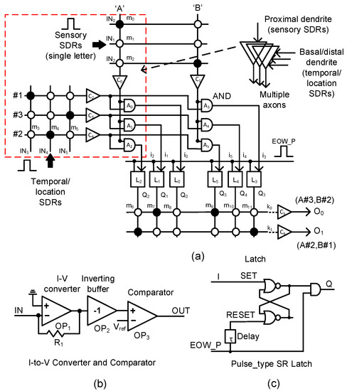 In Figure 4a, we propose a memristor-CMOS hybrid circuit that has the input and output layers for the temporal-pooling of sequences such as words, sentences, etc. Here, the sensory SDR vectors enter the proximal dendrites of m0, m1, m2, etc. The temporal/location SDR vectors are connected to the basal/distal dendrites of m3, m4, m5, etc. One thing to note in Figure 4a is that each neuron is allowed to have only a single proximal dendrite. However, for the basal/distal ones, the neuron can have multiple dendrites, as explained in Figure 2. The sensory SDR and temporal/location SDR are collectively received by the input-layer neurons. The column current of the sensory SDR “A” is delivered to C0, where the column current is converted to a voltage and then compared with the threshold. The detailed schematic of C0 is shown in Figure 4b. Similarly, the column current of “B”’ is delivered to C1. The temporal/location SDR vectors of “#1”, “#3”, and “#2” generate the row currents which are delivered to C2, C3, and C4, respectively. A0, A1, and A2 are the AND gates that combine the sensory information of “A”’ with the temporal/location SDRs of “#1”, “#3”, and “#2”, respectively. The outputs of A0, A1, and A2 are represented with i0, i1, and i2, respectively. They enter the pulse-type set-reset latches of L0, L1, and L2, respectively. The pulse-type set-reset latch is shown in Figure 4c. L0 can be set if the SDR “A” and SDR “#1” are recognized at the same time. L1 is set for “A” and “#3”. L2 is switched to the SET state for “A” and “#2”. Similarly, L3, L4, and L5 can respond to the input SDR of “B#1”, “B#3”, and “B#2”, respectively. The set-reset latch in Figure 4c is reset by the delayed version of the “EOW_P” pulse from the delay line τ. Here, “EOW_P” means the pulse indicating the end of the word. “EOW_P” is generated when the word ends.