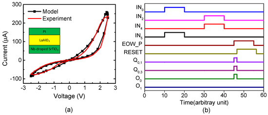 Figure 5a shows a current–voltage relationship of the measured memristor that was obtained by a Keithley-4200 (Semiconductor Characterization System, Tektronix, Inc., Beaverton, OR, USA) [35]. The measured memristor’s film is a Pt/LaAlO3/Nb-doped SrTiO3 stacked layer [35]. Here, the LRS and HRS were measured as 10 kΩ and 1 MΩ, respectively. The black line in Figure 5a represents the behavioral model of memristors [35]. The measured data are represented with the red line. The behavioral model described by Verilog-A was used in the circuit simulation of the hybrid circuits of memristors and CMOS in this paper. Here, the circuit simulation was performed using CADENCE SPECTRE (Cadence Design Systems, Inc., San Jose, CA, USA) and SAMSUNG 0.13-µm circuit simulation parameters [36]. The mathematical equations of the Verilog-A model of memristors were explained in a previous publication in detail [35].