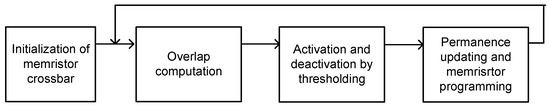The operational steps of simple Hebbian learning of memristor crossbars: initialization, overlap computation, activation and deactivation by thresholding, and permanence updating and memristor programming. Here the memristor programming based on Hebbian learning does not need the complicated backpropagation calculation.