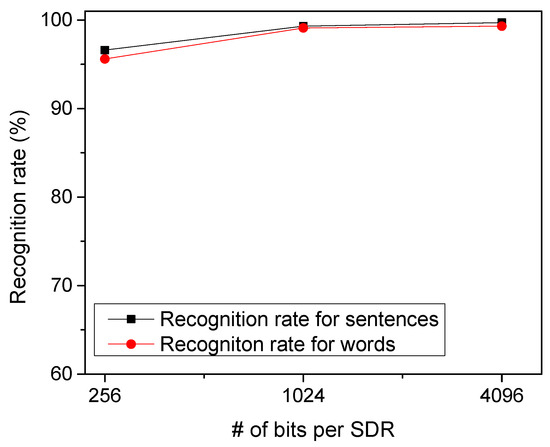 The recognition rate of words and sentences with varying the number of bits per SDR.