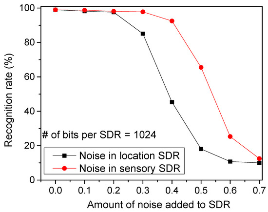 Figure 9 shows the recognition rate by varying the amount of noise added to SDRs. The noise is added by randomly flipping a fraction of the active bits to inactive, and vice versa so that the sparsity can be maintained constant. As shown in Figure 4a, the temporal-pooling circuit receives both the sensory and location SDRs from the spatial pooler. Here, the red circles represent the recognition rate for the noise added to the sensory SDRs. The black boxes are for the noise added to the location SDRs. From this figure, the noise added to the location SDRs seems more critical in terms of recognition rate. If a noise as large as 40% is added to the location SDRs, the recognition rate becomes as low as 45.3%. However, the rate can be as high as 92.5% for the same amount of noise added to the sensory SDRs.