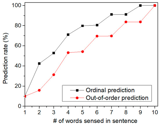 The prediction rate of sentences by increasing the number of words sensed for recognizing the sentences: Here, both the ordinal and out-of-order sequences can be recognized by the temporal-pooling memristor crossbar circuit proposed in this paper.