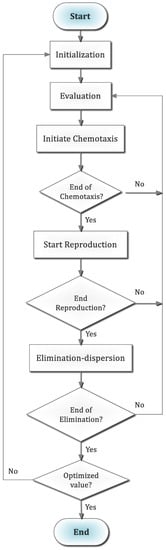 In the above fashion, the bacteria is never satisfied with the nutrients they get, and thereby they keep searching—it indicates the continuous nature of the chemotaxis, swarming, reproduction, and elimination and dispersal steps. The flow chart of BFO is shown in Figure 2.
