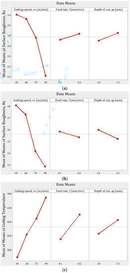 Effects of control factors on (a) mean of surface roughness, Ra, (b) mean of surface roughness, Rz, and (c) mean of cutting temperature.