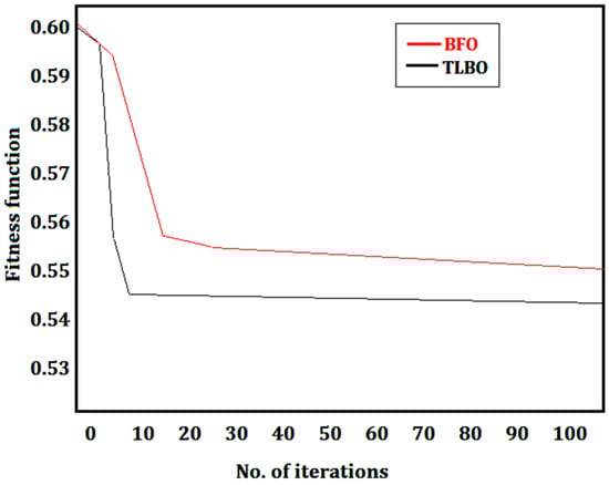 A comparison of TLBO and BFO revealed that the best solution was given by the TLBO method (Z is minimum = 0.54326). Further, this solution was found within the lowest time—for TLBO the time was 4 s while that for BFO was 16 s—and four times faster than the BFO. The convergence of the TLBO and BFO is illustrated in Figure 4. With the number of iterations, the overall fitness function of the TLBO aligns better to the optimum fitness function value. Hence, between the TLBO and BFO, the TLBO is recommended.