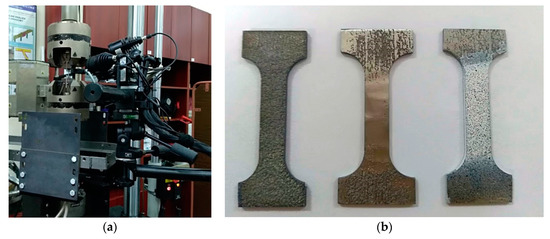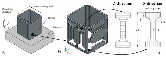 The square-box geometry was developed in such a manner that the dumbbell specimens can be easily cut out in two directions: X-direction according to the laser beam scanning path and Z-direction consistent with the direction of the structure manufacturing (Figure 2a). The BP-97d electro discharge machining device (SEW MET, Ligota, Poland) was used for the cutting process. It is worth noticing that a smaller thickness was impossible to be obtained due to technological constraints. It was also required that the corner radius was large enough to not initiate cracking during tensile tests. Specimen geometry was designed to satisfy a 1:5 ratio of width to length measurement condition included in PN-EN ISO 6892-1. The specimen geometry was the smallest possible, in which the Aramis system could correctly measure the deformation. The dog bone samples were cut out in two directions to analyze the anisotropy of the material and its impact on the stiffness parameters of the samples [12,35,36]. The samples were tested for the material before and after heat treatment [16,34]. In addition, the roughness was measured, which allowed for the determination of the quality of the surface after production.