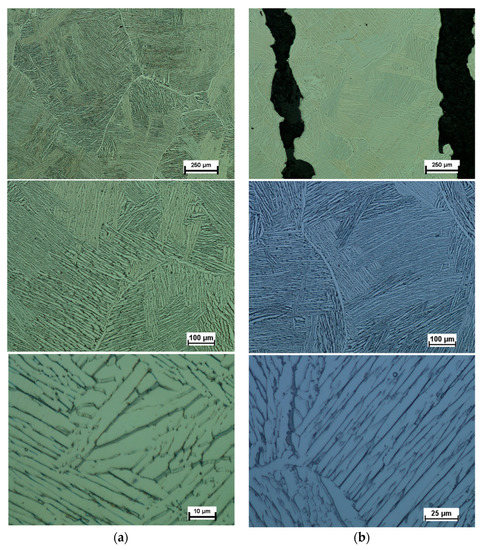 In the LENS process, application of the successive powder layers re-melts the grains, which serve as seeds, causing the epitaxial growth of subsequent columnar grains. Figure 5 shows the results of optical microscopy exam microstructure of the alloy before heat treatment in the longitudinal section (Figure 5a) and in the cross-section (Figure 5b). The analyzed samples were characterized by a coniferous microstructure, which was formed, first of all, on the grain boundaries of β phase and gradually filled up the entire grain space. The obtained microstructure of LENS Ti-6Al-4V is similar to a microstructure reported during research [10,11,13].