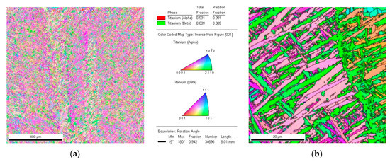 The EBSD data produced the inverse pole figure maps, pole figures, and orientation distribution functions (represented by generalized spherical harmonics). Figure 7 illustrates an EBSD orientation map of the LENS Ti-6Al-4V as-built. EBSD analysis proved the absence of β phase (phase fraction below 1%) in the Ti-6Al-4V alloy structure immediately after production. The martensite needles with different crystallographic orientations are clearly visible. The presence of wide-angle boundaries (above 15°) was detected. It means that a single grain was martensite needle, whose typical structure and morphology are shown in Figure 7b.