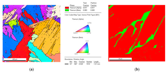 EBSD orientation map of LENS Ti-6Al-4V (a) after heat treatment; and (b) phase distribution map.
