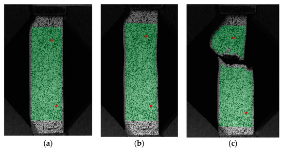 Picture of the specimen as-built with the analyzed area, marked with a green color: (a) Stage “0” at the beginning of the test; (b) stage in the middle of the test; and (c) stage registered in the first frame after failure.