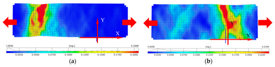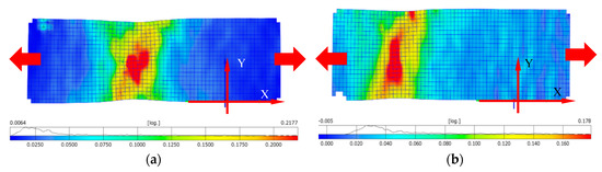 Map of principal strain before failure in the specimen after heat treatment: (a) X-direction; and (b) Z-direction.