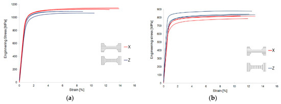 In Figure 12, engineering stress vs. strain characteristics, calculated from the uniaxial tests, are presented for X and Z specimens. The results before and after heat treatment are shown in Figure 12a,b, respectively. For the as-built specimens, X-direction of cutting resulted in slightly higher ductility, whereas in the Z-direction an opposite correlation was observed. A visible influence of the heat process was observed in the decreasing of strength while increasing the ductility.
