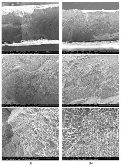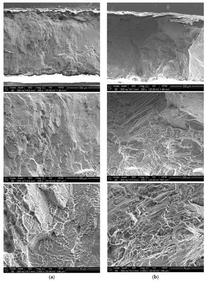 Fracture surface analyses were conducted using secondary electron imaging on a scanning microscope. In the case of as-built samples, a brittle-ductile fracture, with a predominantly brittle fracture, was obtained (Figure 13a). Although the dimple rupture dominated, quasi-cleavage facets features of a brittle type were observed. After the tensile tests, the fracture surfaces in the as-built and stress-relieved samples resembled a “cup and cone”, which is a characteristic for ductile types of the fractures (Figure 13b and Figure 14b). The presented fractographs are similar to the previous studies [10,11].