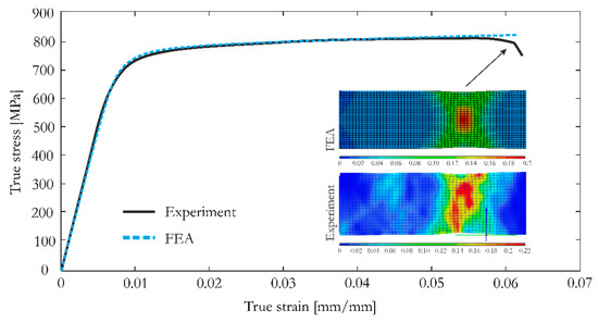 Correlation of the constitutive model based on true stress vs. true strain curves and strain distribution within the specimen neck: Finite Element Analysis (FEA) and experiment.