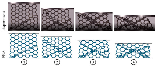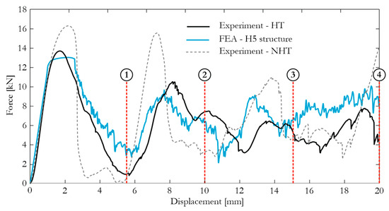 The results of experimental tests and numerical simulations were compared. In Figure 16, force characteristics are presented, and the experiments with the honeycomb structure after (depicted as HT) and without the heat treatment (depicted as NHT) are also included. A satisfactory reproduction of the actual results can be observed, and the influence of heat-treatment is visible, resulting in a more brittle fracture of the structure with no heat-treatment effect. Thus, the obtained results confirmed the observations during the tensile test (see Section 3.2). In Figure 17, the comparison between the deformations of the structure observed during experimental and numerical tests are presented. Four selected time frames of the compression process were considered for comparison purposes. An excellent reproduction of the structure behavior can be observed with a similar fracture characteristic in all stages. The FEA results proved that the discrete representation and the constitutive model, with the properties obtained from the discussed uniaxial tensile tests, were correctly developed.