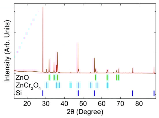 XRD measurement of the sample described in the experimental section is shown in Figure 1. Two crystalline phases were identified: a wurtzite ZnO and a spinel ZnCr2O4 phase. Except for the Si pattern used as a reference, no other phases were observed. Furthermore, the peaks were sharp and narrow, indicating high crystalline quality. The ZnO pattern was characteristic of the non-centrosymmetric wurtzite structure, while ZnCr2O4 crystallized in the antiferromagnetic spinel structure. The refined cell parameters of the ZnO and ZnCr2O4 can be found in Tables S1 and S2 (Supplementary Materials), respectively. The atomically resolved STEM images in Figure S1 also confirm the existence of these two phases. Experimentally determined unit cell dimensions for the ZnO phase were a = b = 3.2505(4) Å and c = 5.2059(6) Å. There was a slight shift from the original unalloyed ZnO with a = b = 3.2555(2) Å and c = 5.2152(3) Å []. Note that the ionic radius of Cr3+ (0.064 nm) was smaller than that of Zn2+ (0.074 nm) in the tetrahedral coordination. The peak shift and decreased lattice constant c confirmed the successful incorporation of Cr3+ ions into the ZnO host lattice, substituting for the Zn2+ sites []. The concentration of Cr was approximately 0.8 at% based on the EDX quantification in this work.