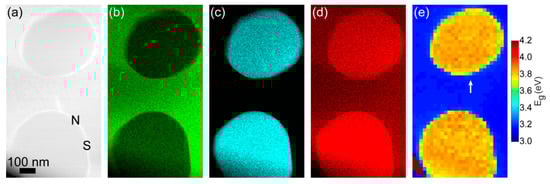 The inclusion of ZnCr2O4 particles in a matrix of ZnO can be seen in the annular dark field (ADF) image in Figure 2a and in the corresponding EDX maps of Zn, Cr, and O in Figure 2b–d, respectively. The sizes of the two particles in Figure 2 were 450 nm (upper) and 500 nm (bottom) in diameter, respectively. EDX mapping such as those in Figure 2b–d confirmed that the diameter of ZnCr2O4 nanoparticles was approximately 100–500 nm. Taking advantage of probe-corrected and monochromated STEM-EELS, we performed two-dimensional band gap measurements of ZnCr2O4 nanoparticles in ZnO matrix. Figure 2e displays the band gap mapping outcome, which was extracted from the same region as elemental EDX maps. The size of this band gap map was approximately 592 nm (width) × 1073 nm (height). The yellow and blue colors represent high and low band gaps, respectively. Interestingly, the contrast shift observed in the ADF and EDX images was closely followed by a change in the absorption onset from the increased band gap of ZnCr2O4 as compared to ZnO. With a fitting range 2.4–2.9 eVfor background subtraction, the average band gap of ZnO was found to be approximately 3.22 eV, with standard deviation of 0.01 eVas extracted from 80 pixels. This is consistent with previous measurements [,]. The average band gap of ZnCr2O4 particles was measured to be 3.84 ± 0.03 eVs, being in line with existing reports for bulk values [,]. These results suggest that STEM-EELS produced reliable band gap measurements of single embedded particles. Furthermore, both sharp and non-sharp interfaces were available by considering different edges of the ZnCr2O4 nanoparticle—see the labels “S” and “N”, respectively (Figure 2a). In the EELS core loss region across a sharp interface (see Figure 4), the delocalization effect was reduced, and an improved lateral resolution could be obtained as compared to the low-loss EELS, but also as compared to the secondary X-ray emission process probed in EDX.