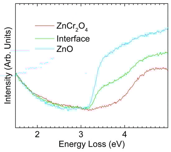 Figure 3 shows low-loss EELS spectra extracted from the spectrum image used in Figure 2e. The spectra were taken from one pixel at the interface, and the two immediately adjacent pixels—one on the ZnCr2O4 side and one on the ZnO side. The three neighbor spectra positions are indicated by the white arrow in Figure 2e. As predicted, it can be clearly seen from the onsets that the band gap of ZnCr2O4 was higher than that of ZnO. The size of each pixel is about 22 nm × 22 nm, which means that for both materials was shorter than the size of each pixel. Thus, the ineleastic delocalization was limited to the interface pixel, where the spectrum revealed a mixture of the ZnO and ZnCr2O4 due to the inelastic delocalization of the bandgap signal [].
