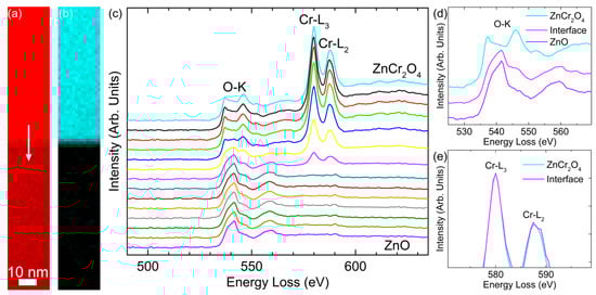 Core-loss maps of ZnO/ZnCr2O4 interface using (a) O-K and (b) Cr-L2,3 edges. ZnCr2O4 and ZnO are located at the top and bottom, respectively. The scan position of EELS profiles in (c) is indicated by the white arrow in (a). (c) EELS profiles of O-K and Cr-L2,3 edges across the interface. The distance between each spectrum is 1.6 nm. Close-ups of (d) the O-K edge at the two phases and the interface position, and (e) the Cr-L2,3 edge at the ZnCr2O4 phase and the interface.