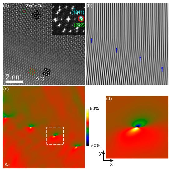 (a) High-angle annular dark-field (HAADF) image of ZnO [23]/ZnCr2O4 [10] interface. The inset at the upper right of the HAADF image displays its fast Fourier transform (FFT), and the circles show the lattice fringes. The simulated images and the corresponding projected models of ZnO and ZnCr2O4 are also inserted, and their close-ups are displayed in Figure S3b,c (Supplementary Materials). (b) Fourier-filtered image of (011)ZnO/(222)ZnCr2O4 lattice fringes with blue arrows indicating the dislocation lines. (c) Geometric phase analysis (GPA) εxx maps. (d) Close-up of the white square in (c).