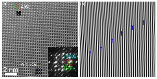 (a) HAADF image of ZnO [110]/ZnCr2O4 [112] interface. The inset at the bottom right of the HAADF image displays its FFT, and the circles show the lattice fringes. The simulated images and the corresponding projected models of ZnO and ZnCr2O4 are also inserted, and their close-ups can be found in Figure S5b,c (Supplementary Materials). (b) Fourier-filtered image of (0002)ZnO/(20)ZnCr2O4 lattice fringes.