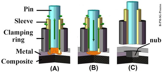 Description of the FSpJ process in three steps: (A) sleeve plunging, softening and deformation of the metal part; (B) spot refilling; (C) retraction of the tool and joint consolidation. (Adapted from Reference [14]).