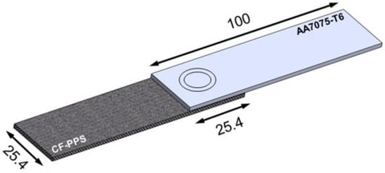 Carbon-fiber-reinforced polyphenylene sulfide (CF-PPS), a quasi-isotropic laminate, was used as the composite part in this work. Moreover, 2.17-mm-thick sheets with 43 wt.% carbon fiber-woven fabric (5H satin configuration) were selected. The carbon fiber fabric reinforcement is stacked as seven plies in the [(0.90)/(±45)]3/(0.90) sequence. CF-PPS is a high-performance thermoplastic composite that presents a continuous service temperature around 100 °C [22]. It was produced by TenCate (Netherlands). Several aerospace applications, such as the “J-Nose” subframe wings of Airbus A380 and the engine pylon cover of Airbus A340-500/600 are addressed for this material [22]. Here a selection of relevant physical and mechanical properties of CF-PPS is listed in Table 3.