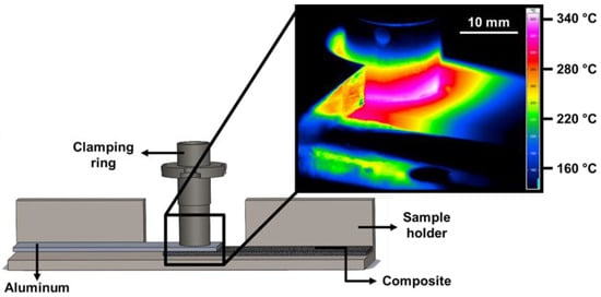 The temperature evolution on the aluminum surface was monitored during the joining process using an infrared thermo-camera (High-end Camera Series ImageIR, Infratech GmbH, Dresden, Germany). The measurement was set within the range of 150–700 °C with a frequency of 20 Hz. The specimens were covered with a black and high-temperature-resistant paint prior to the joining process to avoid deviations regarding the emissivity of the aluminum alloy. Figure 3 shows a schematic example of the set-up for infrared thermography. The peak process temperature was considered as the maximum temperature identified on the aluminum surface.