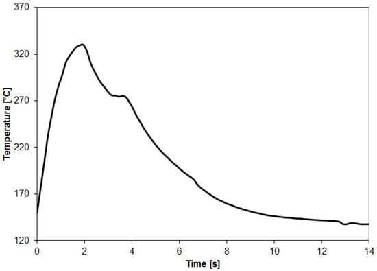 A representative curve of the temperature evolution on the aluminum surface during the FSpJ process (RS: 1900 rpm, PD: 0.8 mm, JT: 4 s, JF: 6 kN).