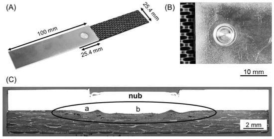 (A) Example of an AA7075-T6/CF-PPS friction spot joint along with typical (B) top view and (C) cross-section of the joints. The metallic nub is indicated with an ellipse in (C). The details of regions a and b are presented in Figure 6. (RS: 1900 rpm, PD: 0.8 mm, JT: 4 s, JF: 6 kN).