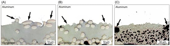 A detailed analysis of the joint’s interface also revealed the sites of micro-mechanical interlocking between the crevices of aluminum and the consolidated composite matrix. As previously discussed, a thin layer of the PPS matrix close to the joint’s interface is melted during the joining process. The molten PPS is displaced from the center to the edges of the joint due to the axial force applied by the tool and the plastic deformation of the metal. Such displacement of the PPS matrix exposes some carbon fibers at the center of the joints to be in intimate contact with the aluminum surface. Figure 6A shows the presence of these fibers anchored by the irregularities of the sandblasted aluminum surface. The entrapment of the PPS matrix into the crevices of the aluminum surface was also identified, as shown in Figure 6B. It is possible to note that an effective micro-mechanical interlocking was achieved because the PPS matrix took the shape of the irregularities of the aluminum surface, while some fibers were entrapped into the crevices.