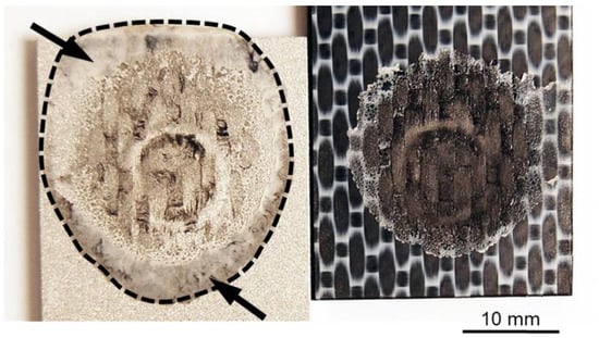 As previously discussed, the generated frictional heat is conducted through the aluminum surface and melts a thin layer of the polymer matrix close to the joint’s interface. Owing to the axial force applied by the tool, the molten polymer is displaced from the center of the joint toward the edges of the overlap area (Figure 7). The layer of molten polymer reconsolidates during the cooling phase of the process, thereby establishing adhesion forces between the aluminum and composite. The bonding area in the friction spot joints can be determined by the perimeter of the reconsolidated molten polymer layer, as indicated by the dashed line in Figure 7.
