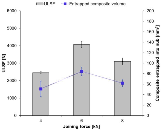 It can be seen that the ULSF of the joints does not show a linear correlation with the applied joining force (Figure 8). The strongest joint was obtained with intermediate joining force (JF: 6 kN; ULSF: 4068 ± 184 N). The joint produced with a low joining force resulted in a ULSF that is about 40% lower (JF: 4 kN; ULSF: 2456 ± 60 N), while the joint produced with a high joining force showed an approximately 24% lower ULSF (JF: 8 kN; ULSF: 3102 ± 199 N) than the ULSF obtained for with intermediate joining force.