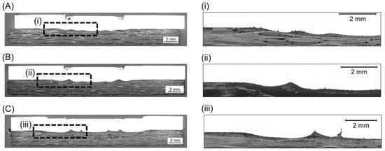 Cross-sections of friction spot joints produced with (A) 4 kN, (B) 6 kN, and (C) 8 kN. Details of the metallic nubs are given in (i), (ii) and (iii) for the joints produced with 4, 6 and 8 kN respectively (constant joining parameters RS: 1900 rpm, PD: 0.8 mm, JT: 4 s).