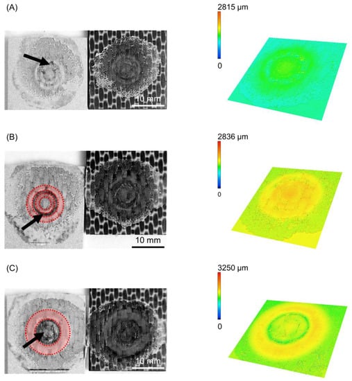 The cross-section of the joints produced by using various joining forces are presented in Figure 9. Furthermore, the fracture surface and respective 3D images of the metallic nub (obtained from the fracture surface of the joints on the aluminum side) are also presented in Figure 10. Different geometries of the metallic nub can be identified in the images. In the joint produced with low joining force (4 kN), the deformation of the aluminum into the composite was very shallow (the metallic nub, Figure 9A). Thus, the macro-mechanical interlocking between the aluminum and the composite is less effective. In this case, the volume of the composite entrapped into the nub was 51 ± 15 mm3 (Figure 10A) and the joints reached the lowest ultimate lap shear force (2456 ± 60 N) for the joining conditions studied in this work. The joint produced with the intermediate joining force (6 kN) presented a more pronounced deformation of the aluminum into the composite (Figure 9B). In this case, the deformation of the aluminum into the composite retained the shape of two rings (ellipses in Figure 10B). This geometry provides two sites of macro-mechanical interlocking between the aluminum and composite, thereby maximizing the volume of the composite entrapped into the nub (84 ± 8 mm3). Therefore, the highest mechanical performance of the joints (4068 ± 184 N) was achieved in this study. The aluminum deformation in the joint produced with high joining force (8 kN) resulted in the shape with only one wide ring (Figure 9C). Such geometry provides only one site for the macro-mechanical interlocking between the aluminum and the composite (Figure 10C). Moreover, the volume of the composite entrapped into the nub was 62 ± 7 mm3. Therefore, a decrease in the ULSF was observed for the joint produced with 8 kN (3102 ± 199 N) compared to those produced with 6 kN.