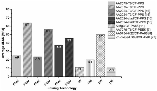 Qualitative comparison of the ultimate lap shear strength (ULSS) of the state-of-the-art and concurrent joining technologies for hybrid structures (AR: as received, ST: surface treatment).