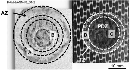 PDZ is the central region of the bonding area where the metallic nub is formed. In this zone, the highest process temperatures are achieved due to the proximity to the tool. The plastic deformation of the metal into the composite displaces a volume of the softened/melted composite’s matrix, thus exposing the carbon fibers on the surface of the composite. Therefore, micro-mechanical interlocking (in the form of PPS and carbon-fiber entrapment into the aluminum surface) was identified in this region as previously discussed (Figure 6A,B). Figure 13B shows that the carbon fibers and the PPS matrix remained attached to the aluminum surface after the failure of the joint by mechanical testing. This feature indicates an effective micro-mechanical interlocking in this zone between the aluminum and composite. Additionally, this residual composite material on the aluminum surface indicates that the crack propagated in this zone through the first plies of the composite part instead of at the interface. Figure 13C shows that the fibrils of the PPS originated from the large plastic deformation of the composite’s matrix during failure. Therefore, the failure occurred in the PDZ through a cohesive failure mode with a predominantly ductile micro-mechanism of failure. Such a ductile micro-mechanism was also reported for metal–composite hybrid joints welded by Resistance Welding [10] and Ultrasonic Welding [8].