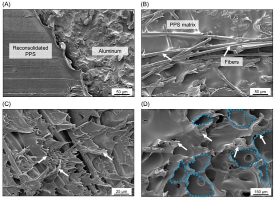 TZ is the transition region between AZ and PDZ. This zone is characterized by the presence of air bubbles formed during the displacement of the molten matrix from the center to the edge of the overlap area during the joining process (see discussion in Section 4.2). Figure 13D shows the air bubbles in this zone on the composite surface. The white arrows indicate plastic deformation sites and tearing of the PPS around the bubbles. It suggests that the cohesive failure mode in the TZ is predominant and that a mixture of brittle and ductile micro-mechanisms of failure occurred. A similar fracture micro-mechanism was also observed for AA2024-T3/CF-PPS friction spot joints in [28].