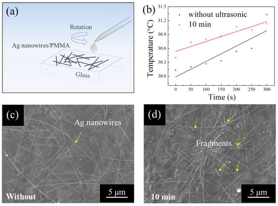 A mixture of poly (methyl methacrylate) (PMMA) was dissolved in tetrahydrofuran (THF). The THF solution was dripped and spin-coated onto glasses at 6000 rpm for 45 s. The film was dried at 80 °C for 1 h. Then, Ag nanowire (with and without ultrasonic treatment) ethanol suspension was dripped and spin-coated onto PMMA layer and was also dried at 80 °C for 1 h.