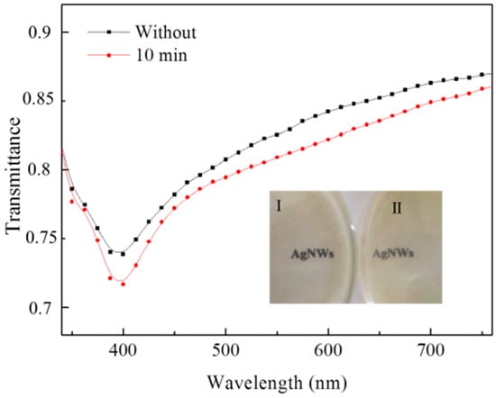 Transmittances of Ag nanowires before and after 10 min ultrasonic treatment. Inset image is the optic images of the Ag nanowire suspension before and after 10 min ultrasonic treatment.