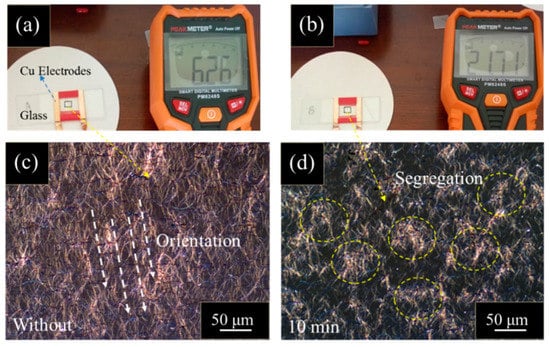 (a,b) Resistivity test of Ag nanowire films without and with 10 min ultrasonic treatment on glass substrates, respectively; (c,d) optic images of the Ag nanowire films without and with 10 min ultrasonic treatment, respectively. The agglomerations of Ag nanowires are marked by yellow dashed circles.