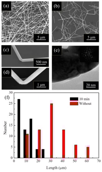 (a) Original morphology of Ag nanowires; (b) Ag nanowires after 10 min ultrasonic treatment; (c,d) bending deformation of Ag nanowire with different diameters; (e) TEM and selected area electron diffraction (SAED) on the bent area of Ag nanowire; (f) statistical results of the length of Ag nanowires before and after 10 min ultrasonic treatment.