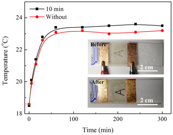 Ag nanowire-based film heaters can be applied on the windows of the electric vehicles for defogging. As reported, the driving distance will be reduced to half or even lower than before, when the tradition hot air is turned on for defogging [25]. This problem is particularly significant for electric vehicle under low temperature. As shown in Figure 5, the Ag nanowire-based film heaters increase the temperature to about 23 °C and successfully remove the fog on it by applying 10 V. Apparently, the thermal conversion efficiency of Ag nanowires with 10 min ultrasonic treatment is higher than that without. Due to the low Joule heat generated in Ag nanowires, this device exhibits stability even after continuous use for 100 h. As a result, the Ag nanowire-based film heaters have great potential application in electric vehicles for defogging.