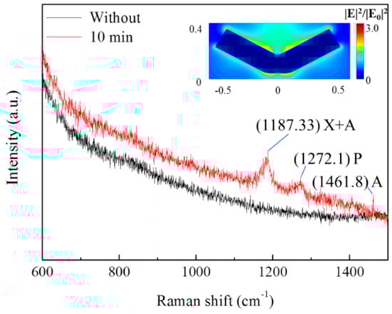 Ultrasonic treatment leads to serious deformation of Ag nanowires and reduces their light transmittance. However, from view of the near field optics, Ag nanowires with bending deformation or fracture into fragments can efficient excite localized plasmon [26], which can provide many hot spots for SERS signals. The localized plasmon on Ag nanowire has been performed by FDTD simulations [11]. A model Ag nanowire 100 nm in diameter and 1 μm in length was adopted. A plane wave light source (wavelength of 538 nm) was used to illuminate the Ag nanowire. A top view of the cross-section of the Ag nanowire was presented in the inset image in Figure 6. Obvious light enhancement could be clearly observed at the bending area and the ends of Ag nanowires. As shown in Figure 6, a drop of Rh6G solution with a concentration of 10−7 M generated intense Raman signals on the Ag nanowire films. The signal from Rh6G at 1187, 1272, and 1462 cm−1 was remarkably increased by ultrasonic treatment. Moreover, similar results could be obtained in other parts of our samples, as shown in Figure S2. As a result, the ultrasonic morphologic modification of Ag nanowires provides an efficient way to enhance their SERS signals, which could be applied widely in Ag nanowire-based SERS detectors.
