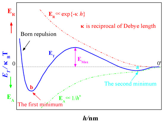 According to classical DLVO theory, the total interaction energy ET between colloidal particles can be expressed as the sum of the Van der Waals energy (EA) and the electrostatic energy (ER), as described by Equation (1) [30].
