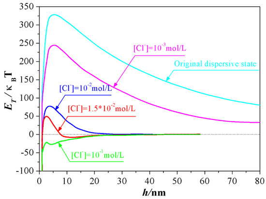 The ability to keep a dispersive or agglomerated state of the charged colloids in water is generally determined by the interplay between attractive Van der Waals (EA) and repulsive electrostatic interactions (ER) [27]. This balance can be changed easily from long-ranged repulsion to irreversible aggregation between colloids via tailoring the experimental conditions such as adding salts. By adjusting the overall interactions between colloids, a different coagulative structure could be maintained. Depending on the calculated interaction energies at varied conditions, Zhou et al. reported that the results obtained from the classical DLVO theory were consistent with the experimental dispersion and coagulation behavior of muscovite [28]. Nosrati et al. reported that the interaction energies calculated using DLVO theory were applicable to the predictions of the dispersive or aggregated behavior of colloidal particles [29].