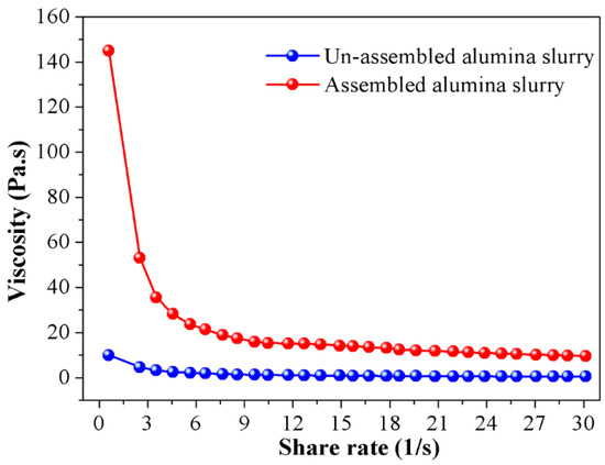 An important method in exploring the rheological property of the alumina slurry is the rheological test, through measuring the viscosity of the slurry, the micro network constructed by alumina particles could be correlated with the presented macro rheological performance. That’s because in such a system, those mechanical properties reflect the microstructure of particles intrinsically, and the viscosity is the result of interactions between ceramic particles. Hence, in order to clarify the effect of particle self-assembly, the viscosity of the ceramic slurry before and after assembly are compared in Figure 3. As depicted in the picture, all slurries had a non-Newtonian behavior and showed a similar shear-thinning phenomenon with the increase in shear rate. The “shear thinning” occurred during the rheological test of the slurry is due to shear disturbances to the suspension structure. At low shear rates state, in order to trigger the flow of the slurry, the particles must flow around or “bounce” between each other, which creates greater resistance therein and a higher viscosity is thus presented in return. When shear rate is increased, the exerted velocity gradient induces the orientation of the particle network which renders the particles to pass through between each other freely at lower shear rate, so the viscosity reduces.