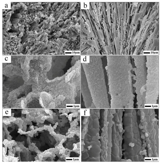 The fracture morphologies of assembled and un-assembled specimens are shown in Figure 4. The assembled samples (A) have a well interconnected and hierarchically arranged open pore structure (Figure 4a,c,e). That is, the micron sized pores constructed by assemble ceramic particle agglomerates and nano scaled pores within assemble aggregate itself, which is detailed by Figure 4c. As can be seen in the picture, the assembled sample is stronger enough to withstand the destruction of freeze drying, that is to say, the original structure build by assemble agglomerates is conserved in general. Consequently, a more homogenous 3D reticulated network could be detected as Figure 4a,c,e illustrated. No unidirectional pores or abnormal large pores were found in assembled samples. Because after the ceramic particles’ self-assembly, the viscosity of the slurry increases, which makes the migration of particles to surface of the ice crystals and the growth of ice crystals much harder. Therefore, the samples have a finer microstructure under such a circumstance. Additionally, the deionized water was surrounded by interlocked ceramic agglomerates of which the network was well organized, hence, the growth of ice crystals was restrained in limited scales and resulting in uniform micro pores in the as fabricated porous Al2O3 ceramics.