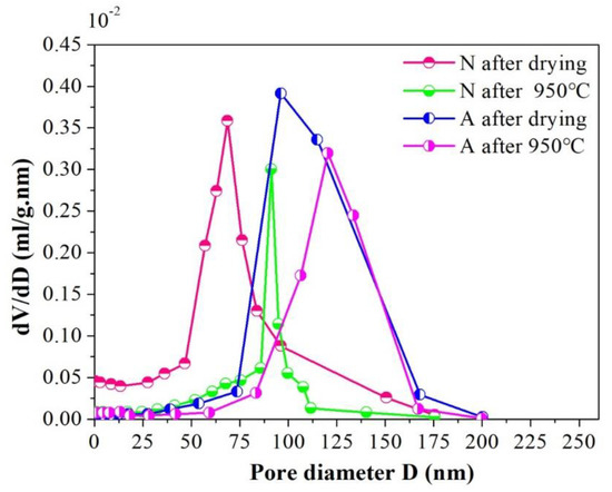 Differential pore volume for samples A and N before and after 950 °C heat treatment.